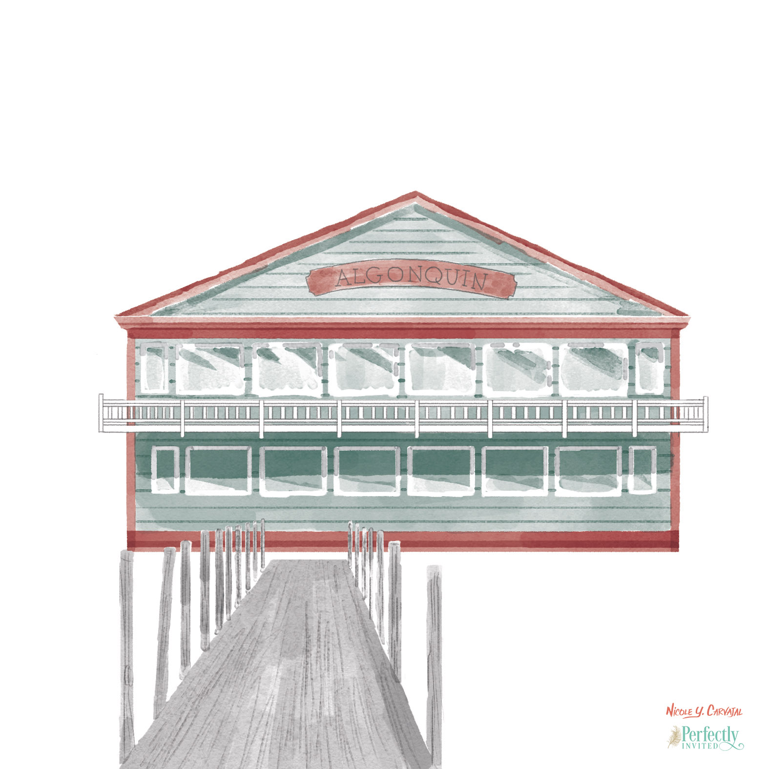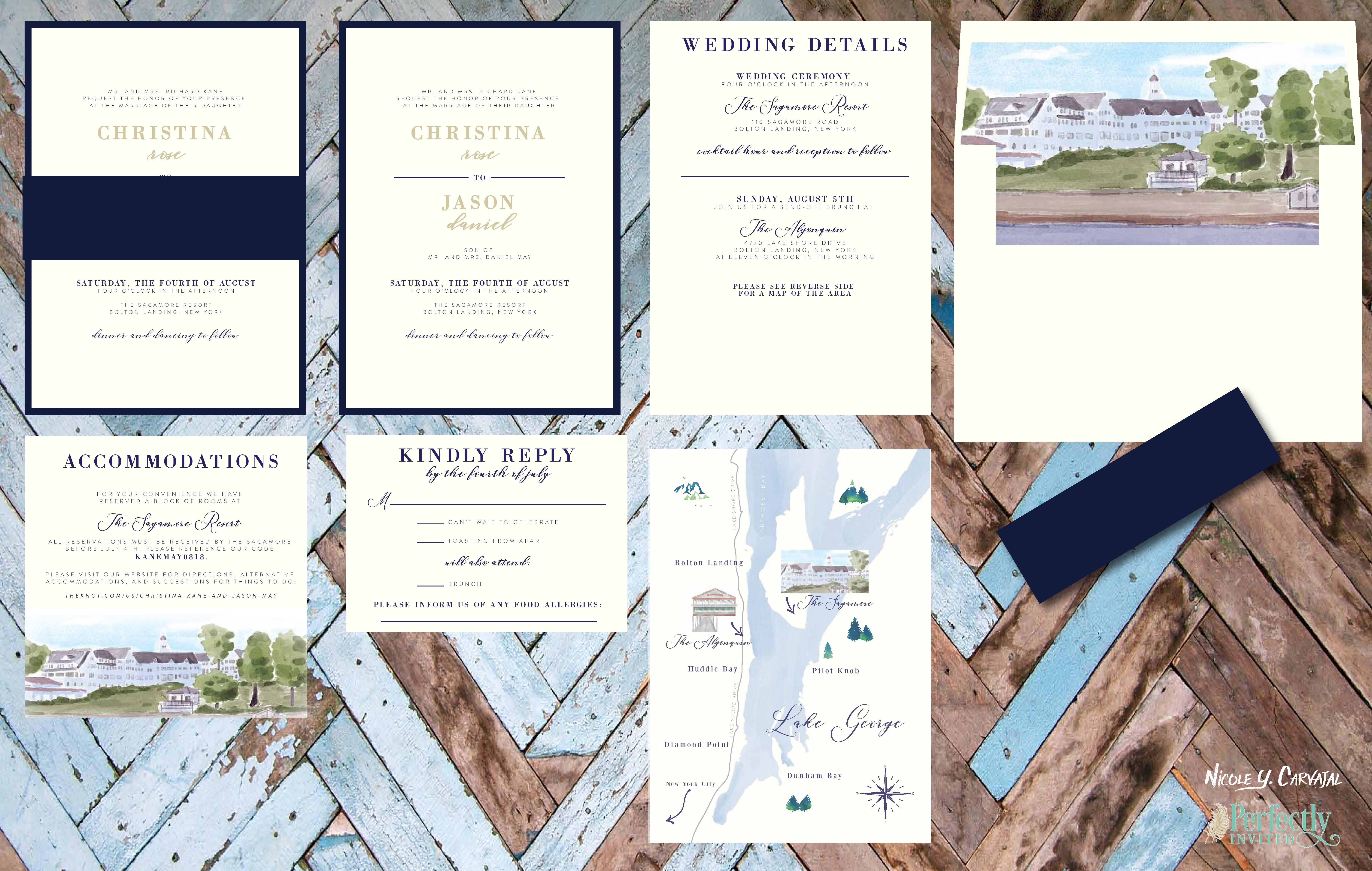 Christina and Jason’s Lake George venue was the centerpiece of their wedding and they wanted their invitation suite to capture the feeling of the area. Nautical inspired design and colors featured throughout the suite I created, including three custom illustrations made for them: paintings for each of their wedding venues and a map to help their guests find their way around the area.