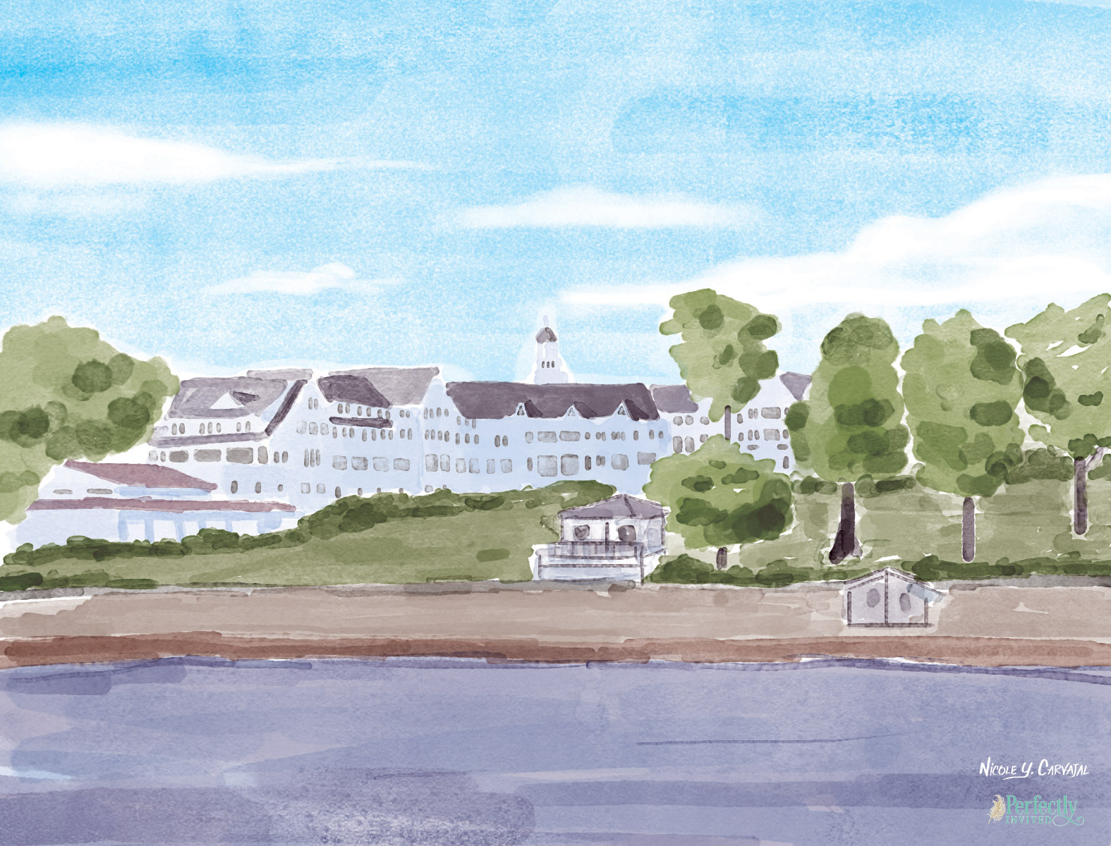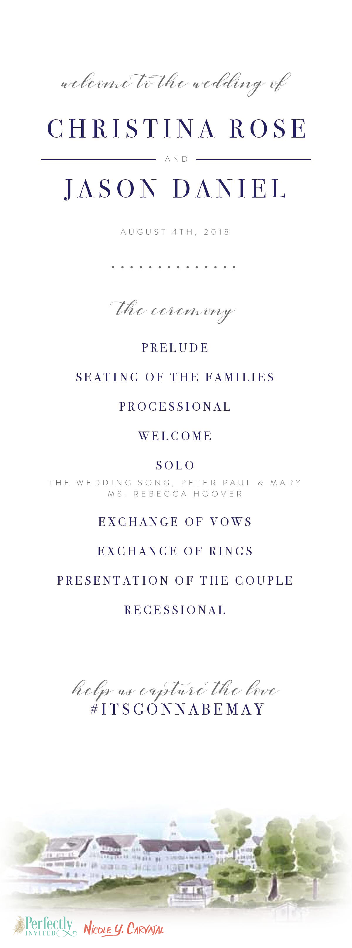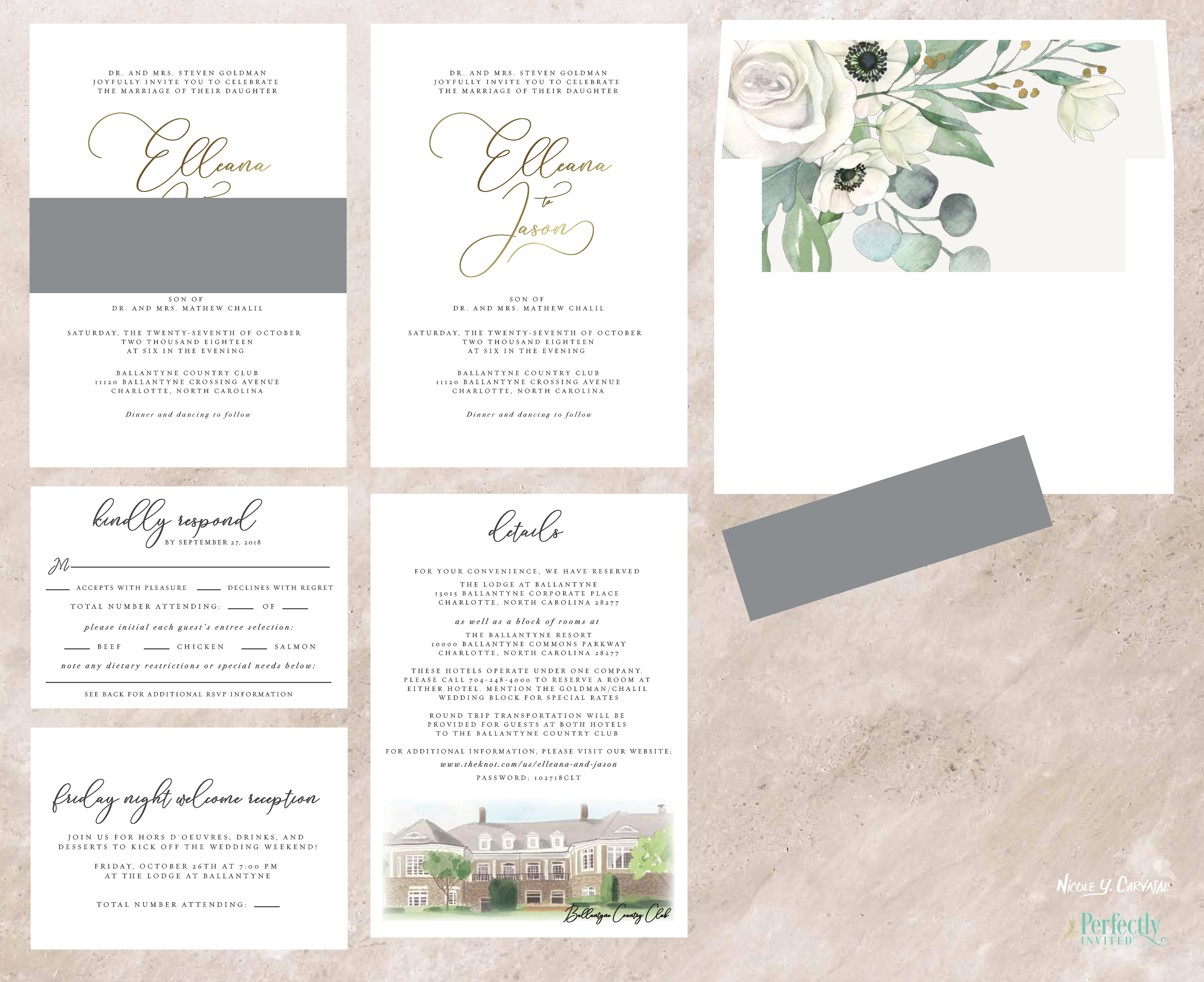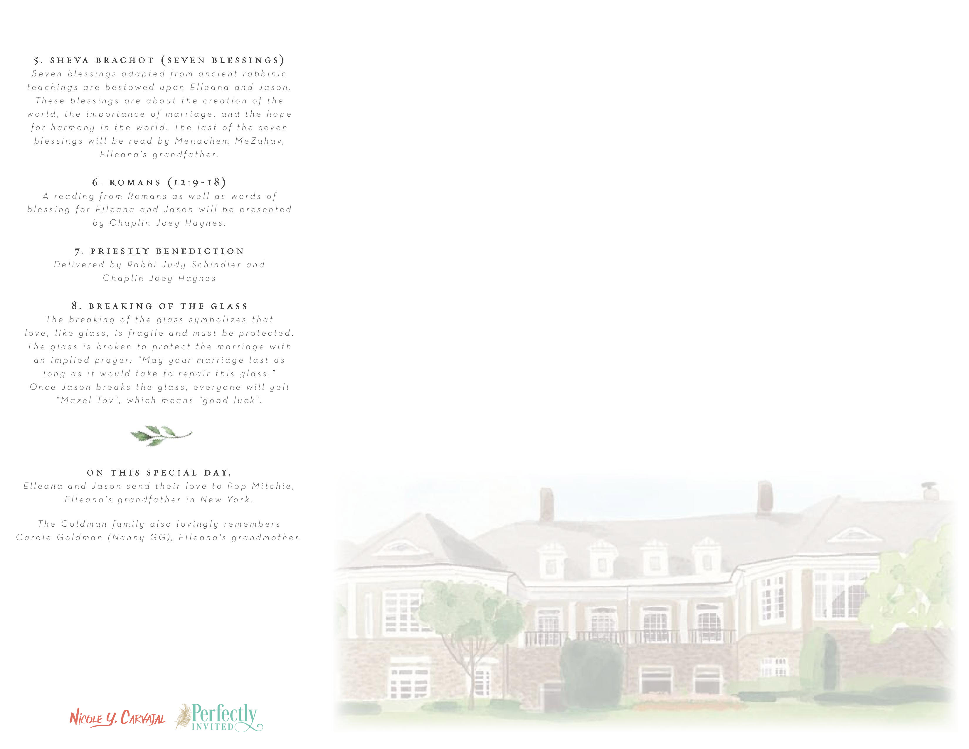 Elleana and Jason were looking for a clean, elegant design with touches of gold and green. In addition to designing their invitations, signs, and ceremony program, I also painted a custom illustration of their venue.