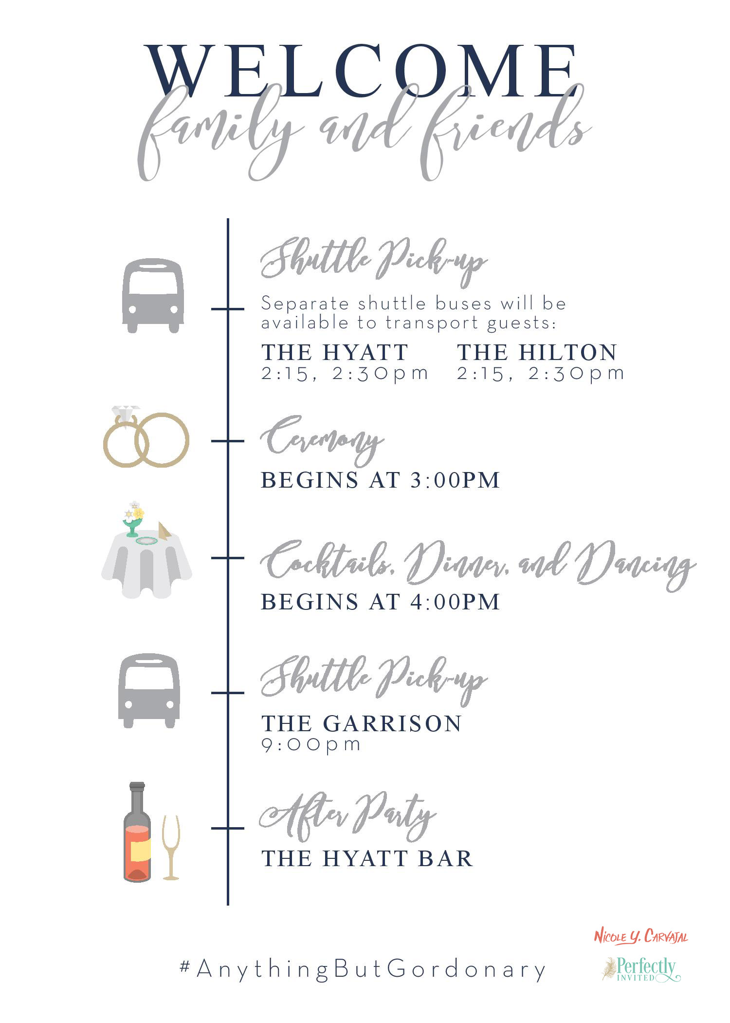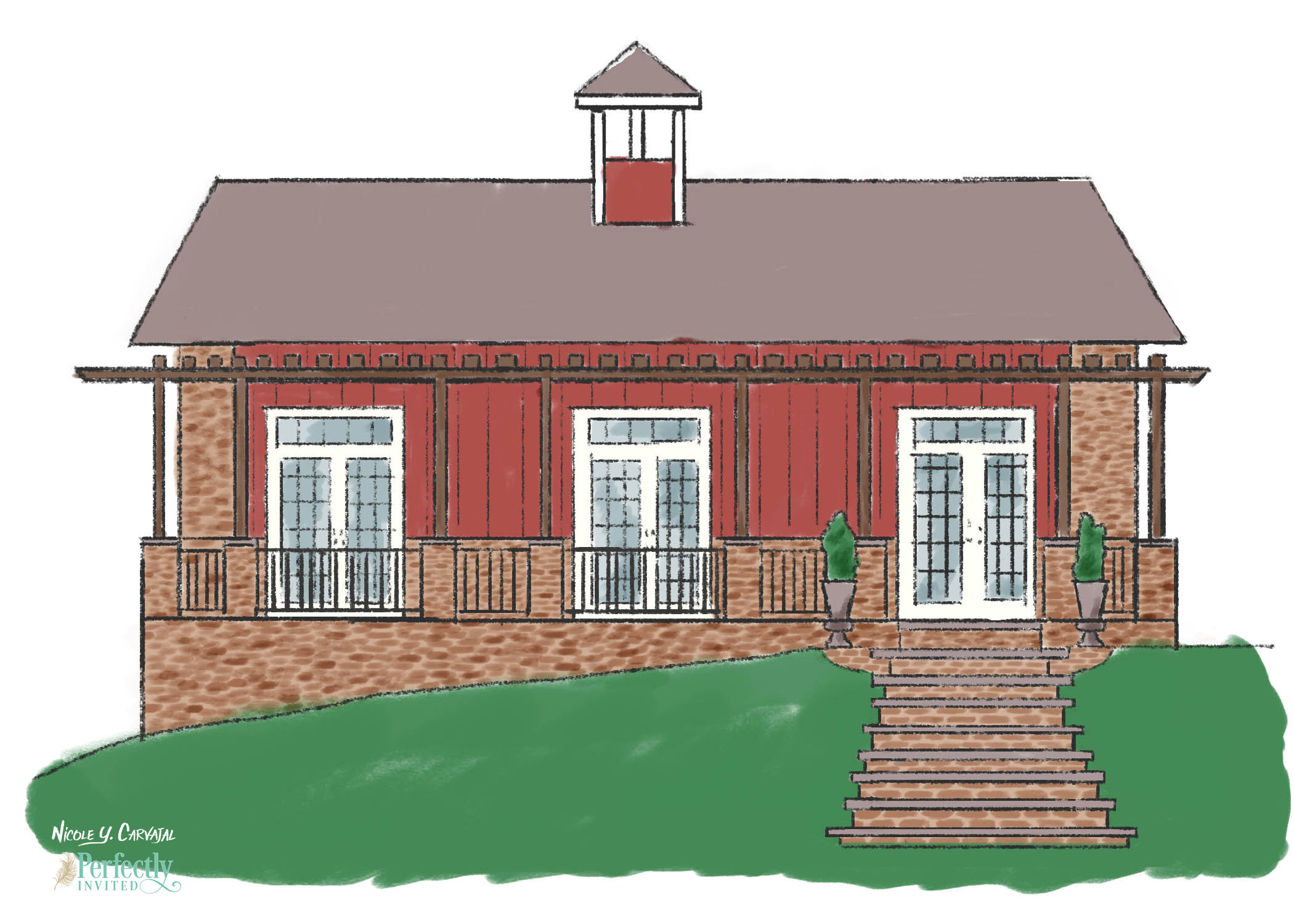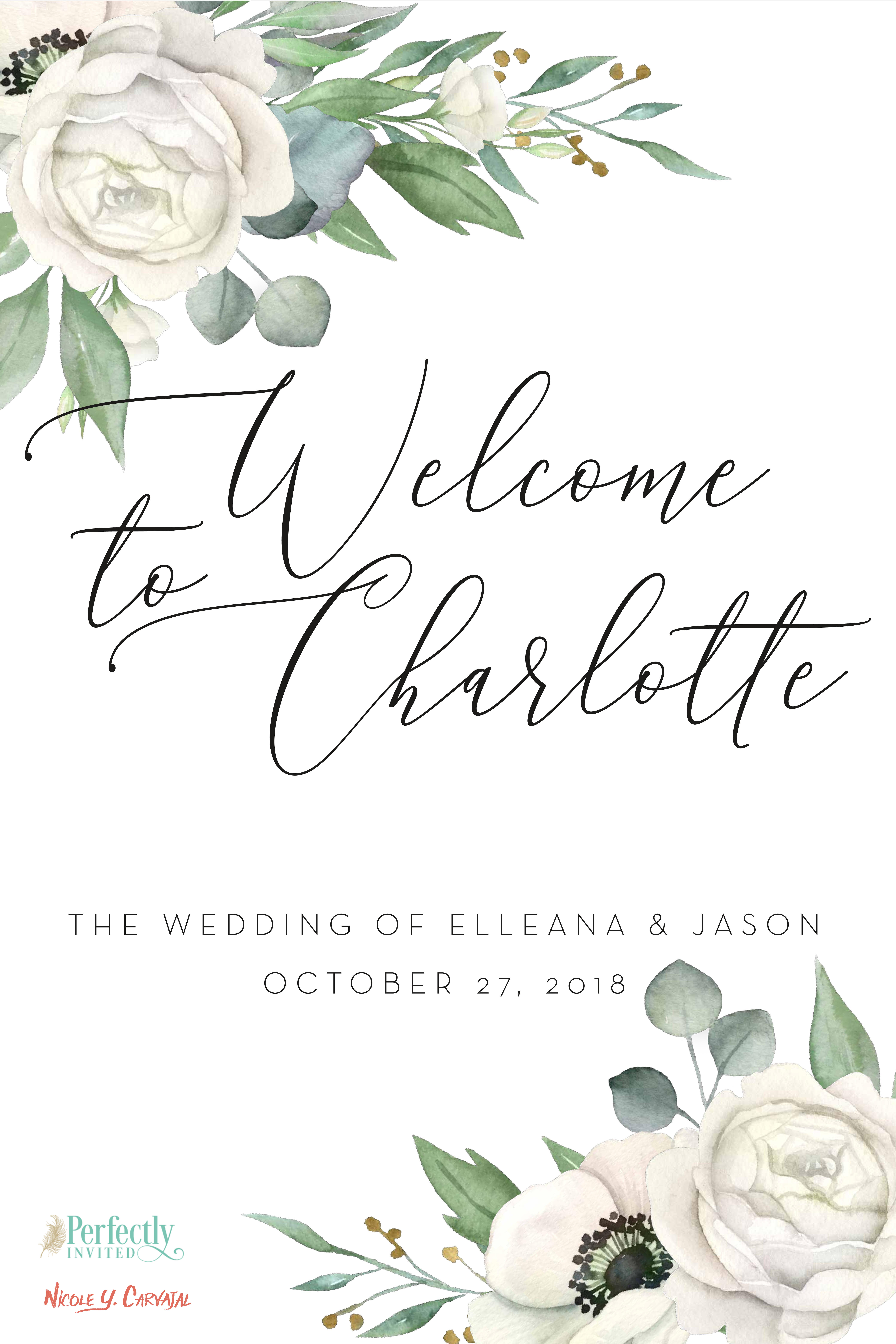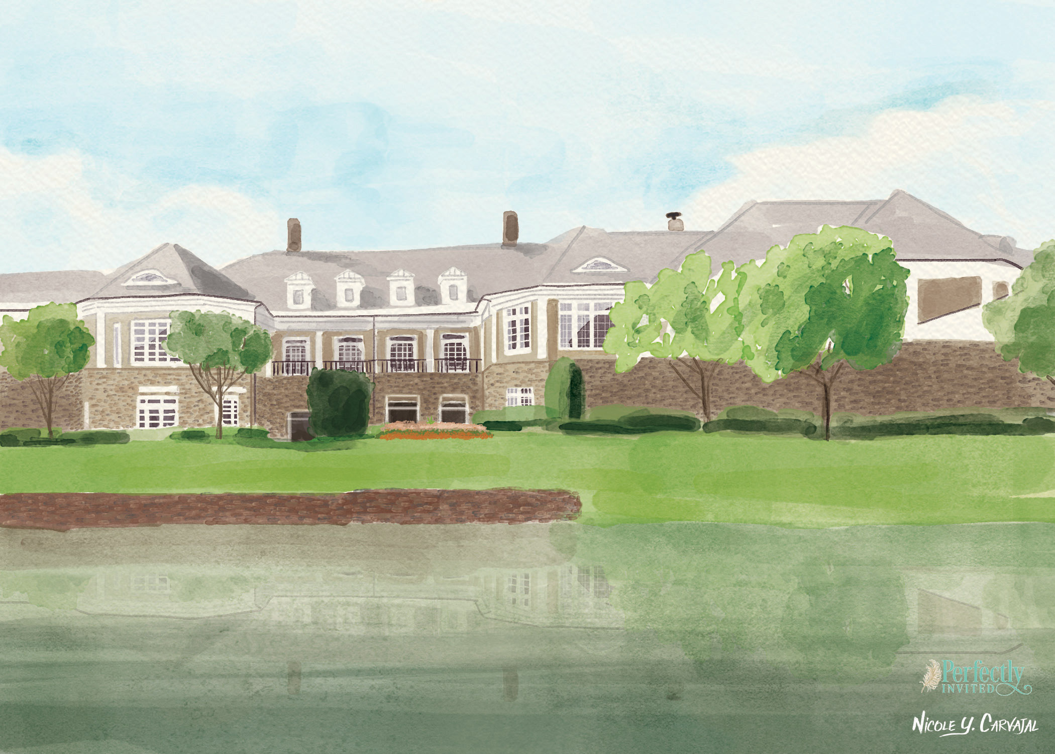 Elleana and Jason were looking for a clean, elegant design with touches of gold and green. In addition to designing their invitations, signs, and ceremony program, I also painted a custom illustration of their venue.