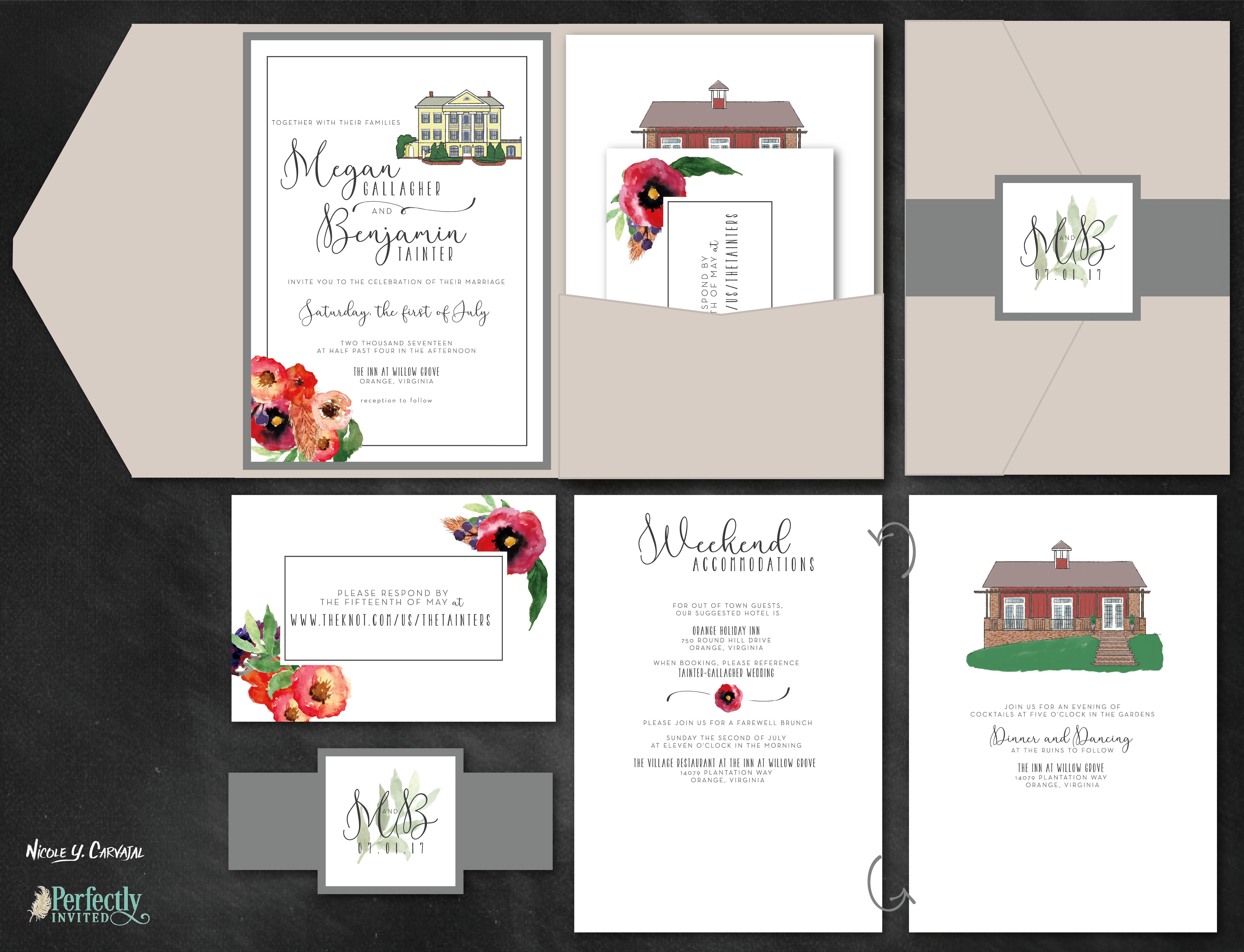 These invitation suites were custom designed by me following consultations with the client to understand their vision and style. Many of these invitation suites also include custom illustrations painted by me.