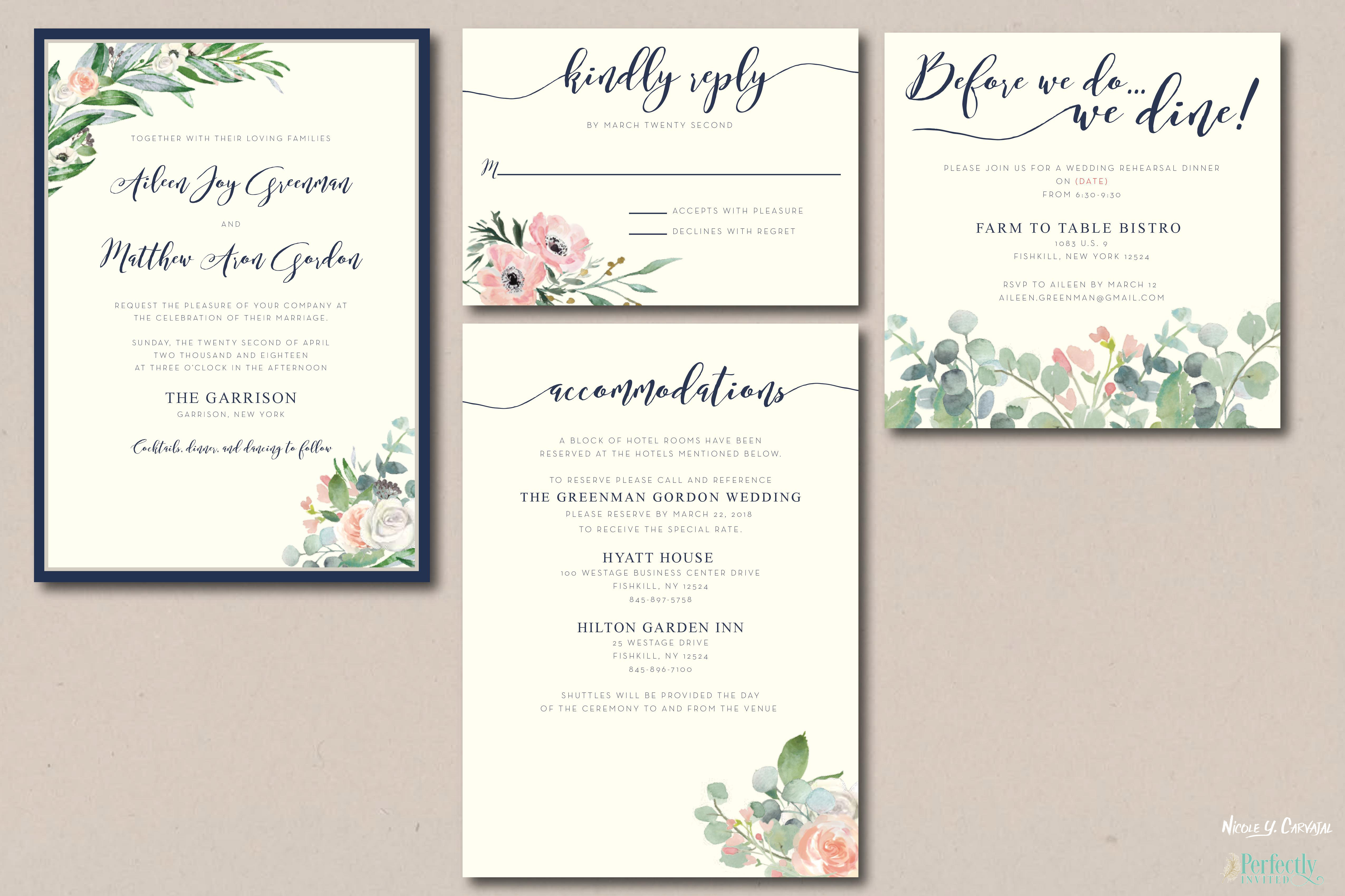 Aileen and Matthew were looking to bring natural elements into their invitation suite, using cream colored paper with touches of greenery on top. The color scheme for the wedding included hints of blush pink, which is reflected in touches throughout the foliage designs. I designed the invitation suite and their day-of items, such as the table place cards and various signage.