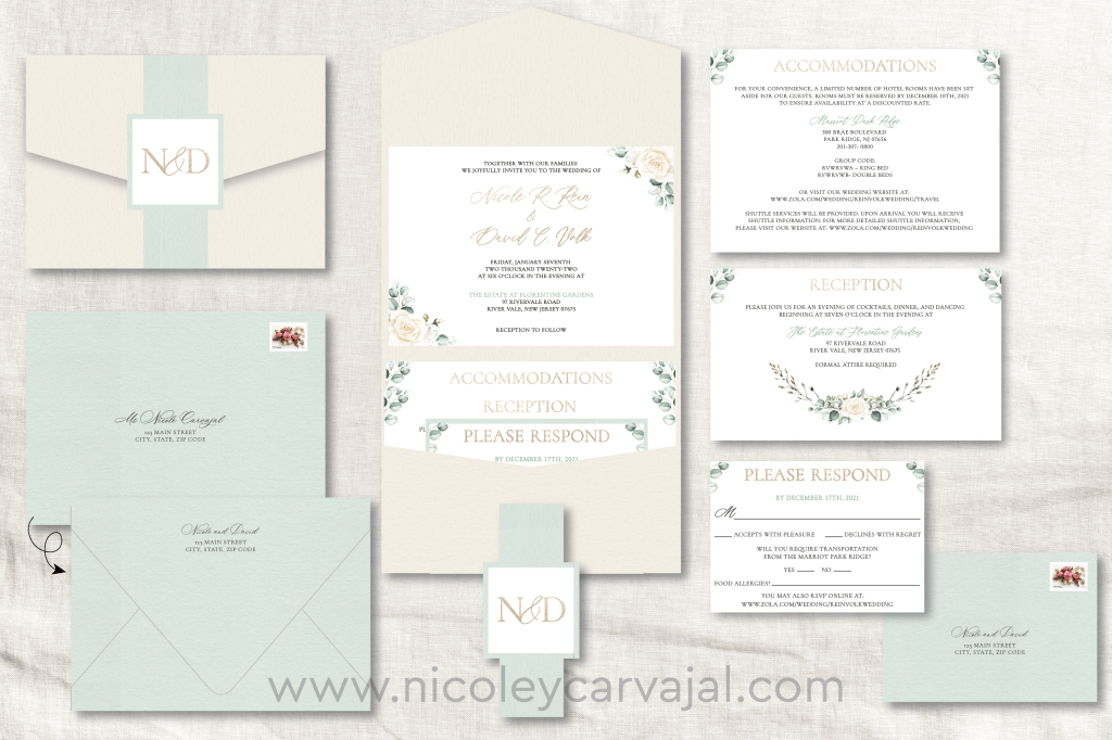 David and Nikki wanted their invitations to reflect the elegant venue and festivities planned for their big day, with touches of green and gold to match their colors. The invitation pieces are nestled in a paper pocket, accented with flowers to match their bouquets.