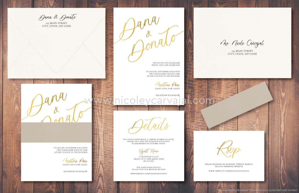 Dana and Donato asked for a contemporary invitation suite that matched their venue’s cool Manhattan skyline views and modern style. The design is neat and impactful, with touches of gold foil giving this modern look a touch of luxury.